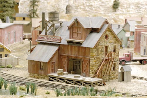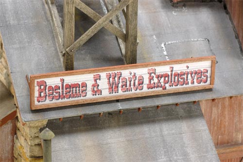 This document features the construction of a plaster and laser cut wood kit once offered by Banta Modelworks. It was originally sold as the, "B. Johnson Leather Works." I altered it a bit and renamed it, "Besleme & Waite Explosives Company," in honor of two model railroading friends and have it prominently located on my Cimarron and Tall Timbers RR. | |