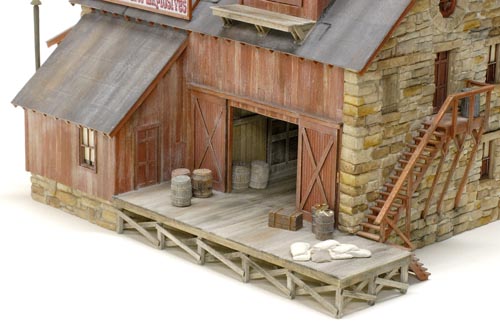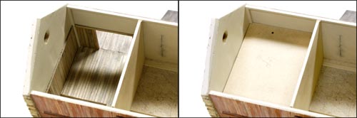![]() Photo 9. The sliding doors to the shipping room were modeled in the opened position. Floor boards were installed to be even with the loading docks. The Masonite second floor is supported by the interior wall planks. It will eventually hold light fixtures to illuminate the room below. | ![]() Photo 10. Weathered, un-painted boards were glued to the walls. Because the shipping room floors were at different elevations, a short inclined ramp was added between them. |