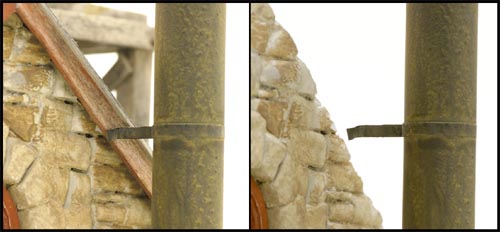 ![]() Photo 17. The stove pipe casting was secured in place with "5-Minute Epoxy. Because the wooden walls were so thin, an small block of wood was glued to the inner wall for additional support. | ![]() Photo 18. The large smoke stack was secured to an engineered supporting bracket on the underside of the boiler room roof with epoxy. Additional epoxy was added around the roof joint and painted with Pactra Glossy Black to represent roofing tar. The conical flashing was cut from index card stock and glued to the stack with Dr. Mikes Gap-Filling CA adhesive. |