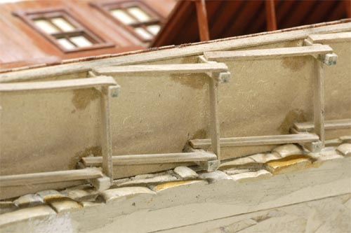 ![]() Photo 7. The roof was designed to be removed and was strengthened with pieces of the Masonite. It's quite strong and is easily lifted off the plaster structure. | ![]() Photo 8. The short pieces of wooden rafter ends were glued in place with white glue. To prevent them from accidentally being damaged in handling, another piece of strip wood, running parallel with the walls, was added to support the tiny pieces. |