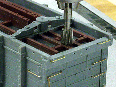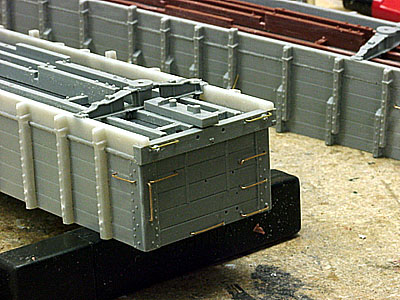 ![]() Photo 3. The center sills have been milled down to the same level as the lower side of the end beam. The coupler floor and draft gear sides can now rest on a smooth flat surface at the correct height. | ![]() Photo 4. I based the side stake extension arrangements on photos in the Narrow Gauge Pictorial Album since I wanted variety in the car sides. |