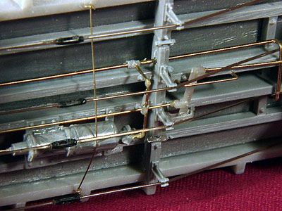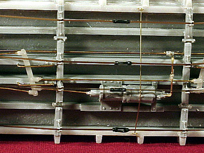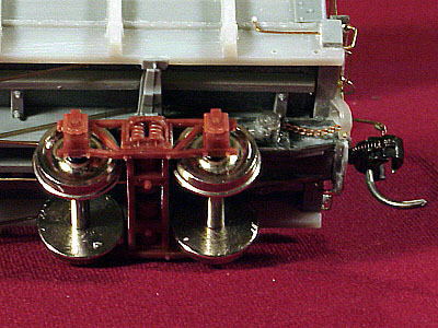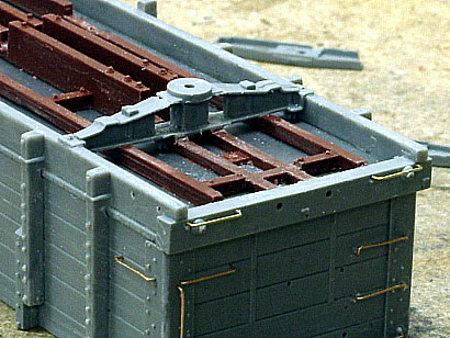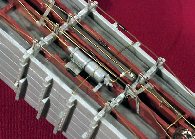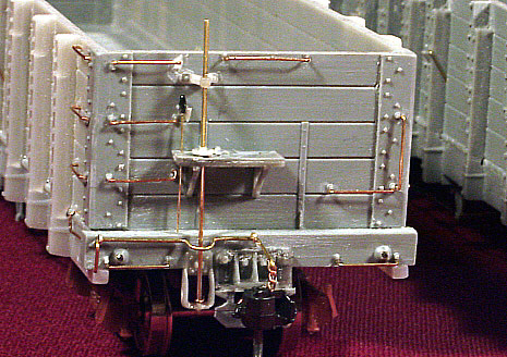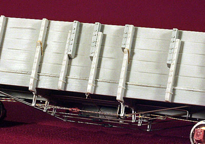 ![]() Photo 9. Rather than just leaving the train line end under the truck bolster, I opted to create the effect that it continues on to the air hose connection. I used a piece of copper wire from a telephone cable to complete the line. It was easy to bend and connect into the casting ring. It along with the complete train line piping was ACC'd into place and is quite solid. A short section of chain was added to the bottom of the brake wheel staff and ACC'd above the draft gear spring casting. | ![]() Photo 10. The details of the underside are shown here. I tried something different, for me anyway, with the truss rods on these cars. The turn buckles were attached to the nylon truss rod material by running the nylon line thru one end of a turnbuckle and out the slot in its side. I then "carefully" melted a tiny flared end on the line that went thru the slot with the flat side of a soldering gun tip. The line was carefully pulled back thru the turnbuckle until the flared end was seated in the end of the turnbuckle. It was further secured with ACC being careful not to fill up the slot in the turnbuckle. The same process was used for the other end of the turnbuckle. When the model is painted and weathered, tiny pieces of wood will be placed between two pairs of turnbuckles in prototype fashion. | ![]() Photo 11. In this underside view, concentrate your attention to the shutoff cock and piping in the line running from the train line to the brake cylinder. Instead of using the supplied styrene parts which I continued to break or knock off, I snipped the shutoff cock casting from the styrene piping material and carefully drilled a hole through it with a #79 drill. A wire was passed through that hole and adjusted to fit between the train line and cylinder. It was secured with ACC and now is very solid and almost indestructable by my misdirected thumbs and fingers. I added a small amount of ACC material to the right angle bends in the wire to suggest pipe elbows. Once they are painted, I believe they will simulate the actual fittings. | ![]() Photo 12. Here's a shot of all four cars with their decals in place. |