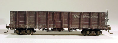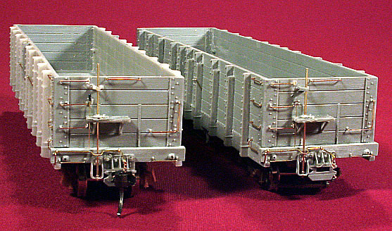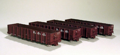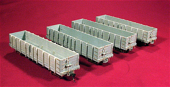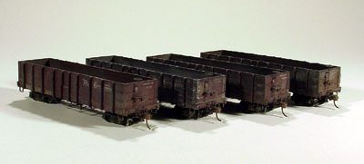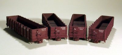 ![]() Photo 5. This view shows some of the details that were added to the underside of the car. | ![]() Photo 6. Here are the four gondolas after much work has taken place. I know I should have taken more pictures of the process, but I didn't force myself enough to push away from the work bench and take the cars to the posing table. Sorry. |