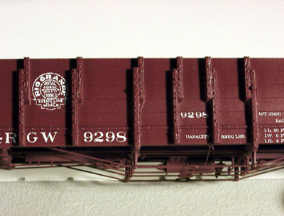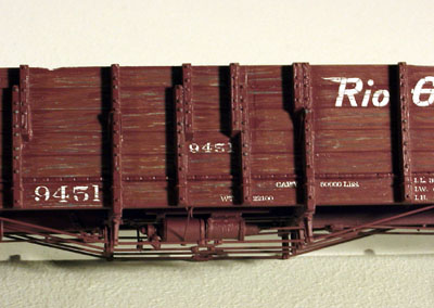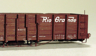 ![]() Photo 15. Here's another view of the knife point scraping and gouging effect. | ![]() Photo 16. Gondola No. 9298 did not receive any gouging at all. I would only weather it with additional layers of paint and other solutions. |