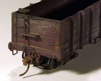 ![]() Photo 19. Car #1530 has see quite a bit of action. Once the decals were applied, all of the cars received an overspray of Polly Scale Engine Black and a sealer coat of clear flat finish. I then gave them a wash with the shoe dye and alcohol solution. A couple of them received a further wash with my rusting solution. This car received an additional wash of Ceramcoat Amish Gray paint. Once those coats were dry, I used artists coloring chalks on all the cars to tone down the shine that had developed. | ![]() Photo 20. Here's another view of car #1530. |