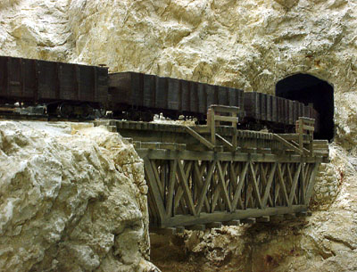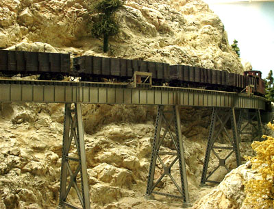 ![]() Photo 23. Here's a view of the cars in service crossing one of the many wooden trestles on the layout. |