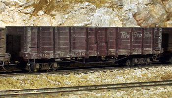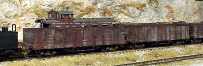 ![]() Photo 30. The final picture shows the gondolas behind a C-21 as they are hauled to one of the mines on the Silver King Branch of the layout. I hope you enjoyed this photo coverage of their construction, painting and weathering. |