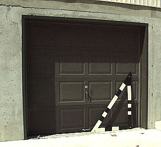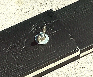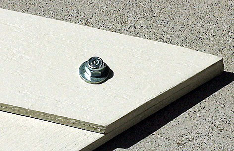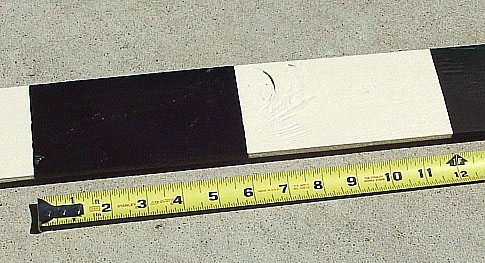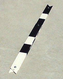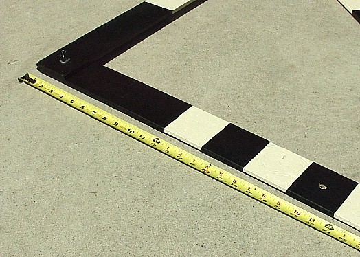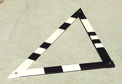 ![]() This is the basic triangle. It's comprised of three pieces of 3/8" exterior grade plywood, painted and marked off in easily seen dimensions and held together with two permanently fastened bolts, washers and locking nuts and a removable bolt, washer and wing nut.The length of each side is 3', 4' and 5' respectively. | ![]() Six inch markings | |