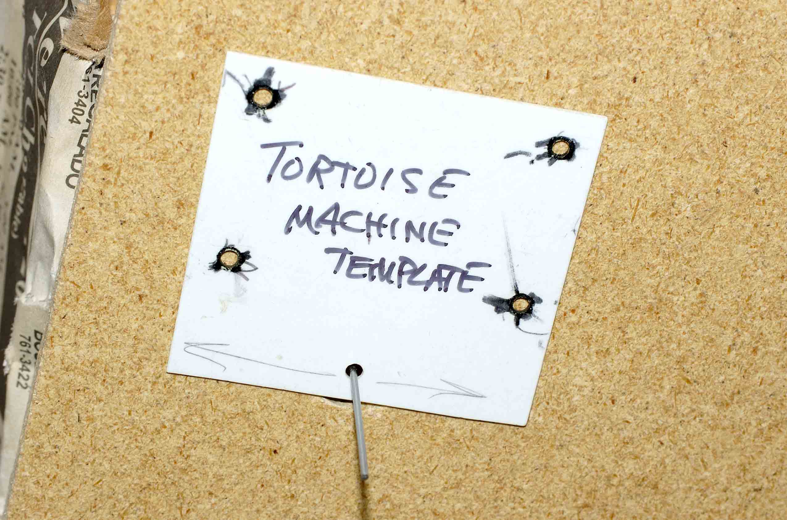 ![]() To position the Tortoise correctly, a styrene drilling template that's based on the diagram included on the instruction sheet is used. After installing more than 50 Tortoise machines over the years, I finally figured out how to make the process easier which simply involves dabbing a small amount of Aleene's Tacky Glue on the styrene and pressing it in place against the underside of the particle board. With the fwire from the throw bar lever jig centered in its appropriate hole, a Sharpie marker pen was used to mark the locations for the four mounting screws. | ![]() The holes were drilled with a Yankee drill driver and, thanks to a special screw holding screwdriver that I inherited from my father, the Tortoise machine was secured in place. The actuating wire was guided up through the hole in the throw bar while its other end was firmly locked in place on the movable arm of the Tortoise. The Dremel tool and cutoff disk were used to remove the excess length of wire, making sure it ends up being low enough to clear rolling stock, yet be long enough to stay in the throw bar. |