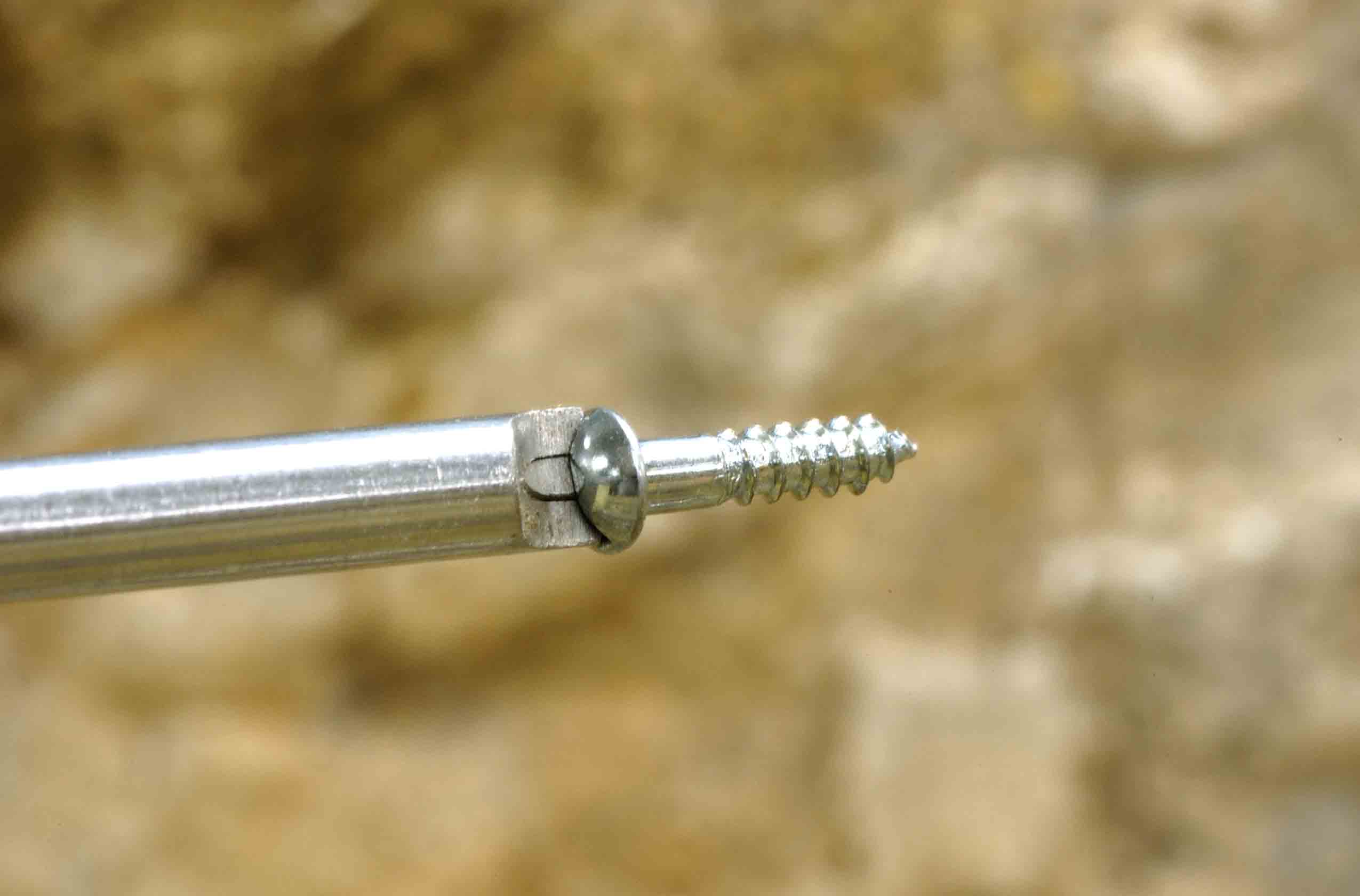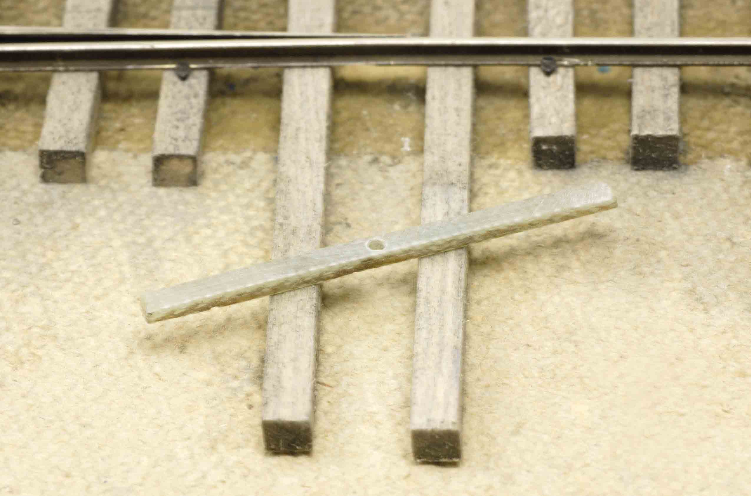 ![]() All the points on the other turnouts on my layout are soldered to the flat head of an 0-80 brass machine screw. The throw bars were made from thin strips of Formica with the underside facing upward. After measuring, locating and drilling holes for the screws, the upper side of the holes were slightly counter sunk to allow the head of the tiny brass screw to sit flush with the surface of the tie. Brass 0-80 nuts were attached to the threads that extended below the throwbar, then tightened to the bottom of the tie. It was loosened to allow the screw to rotate in the hole. When I was happy with the fit, a dot of CA adhesive to the bottom of the nut to secure it to the screw, securing it in place but still allowing the screw to rotate in the hole. | ![]() The bottom surface of the point rails were then soldered to the top of the flat head screw. When the points moved back and forth, the tiny screws rotated. Prior to building turnouts with the small screws, I used to solder the points directly to PC ties. However, over time and usage, the solder joints failed. |