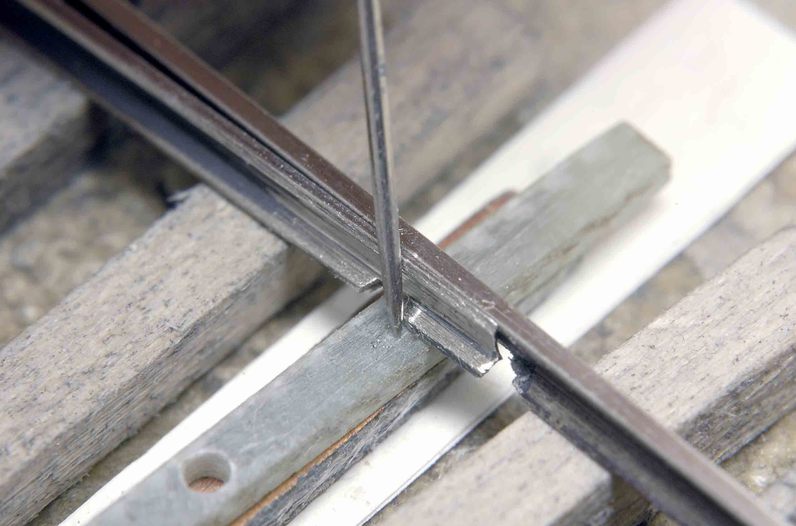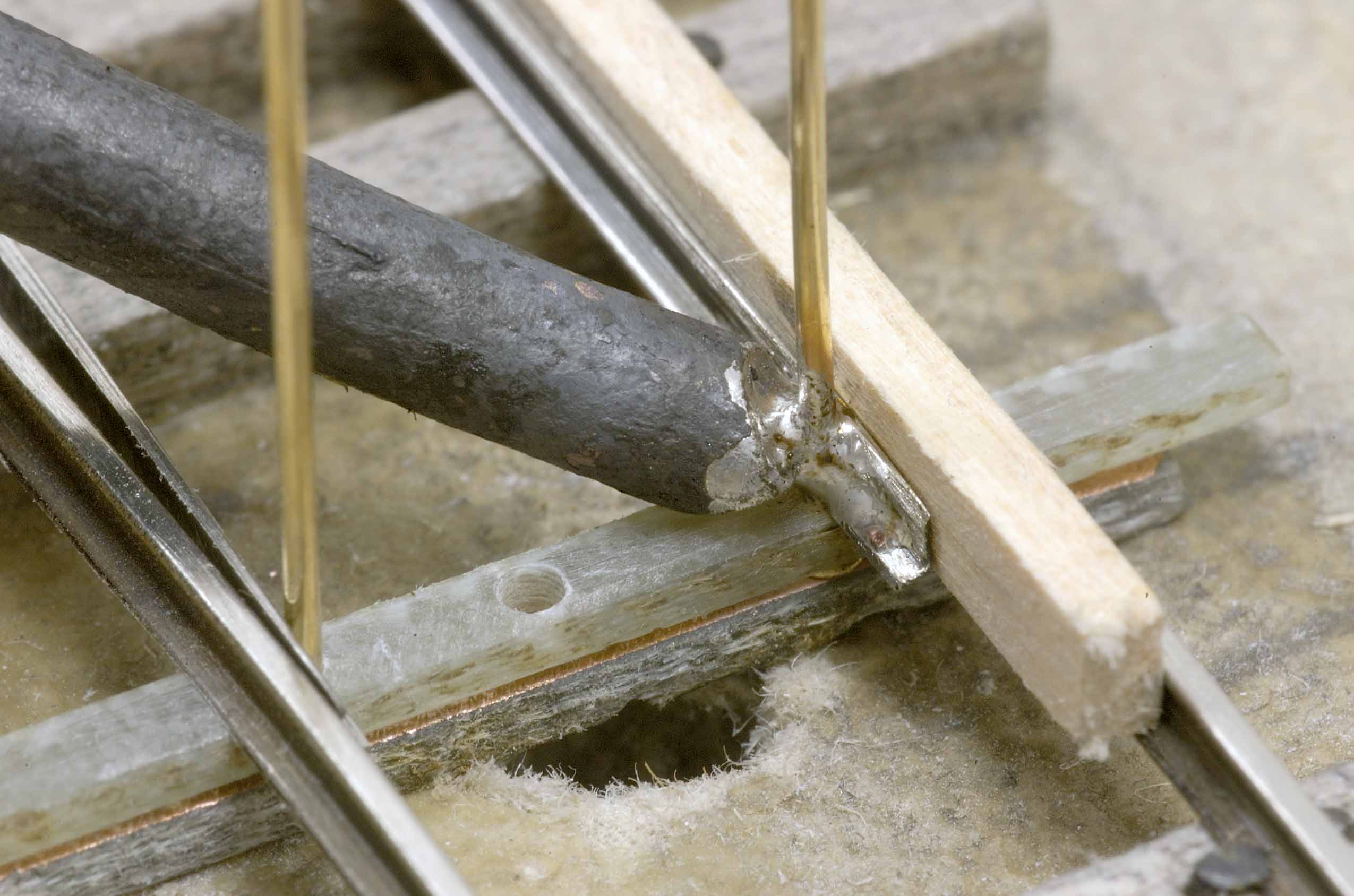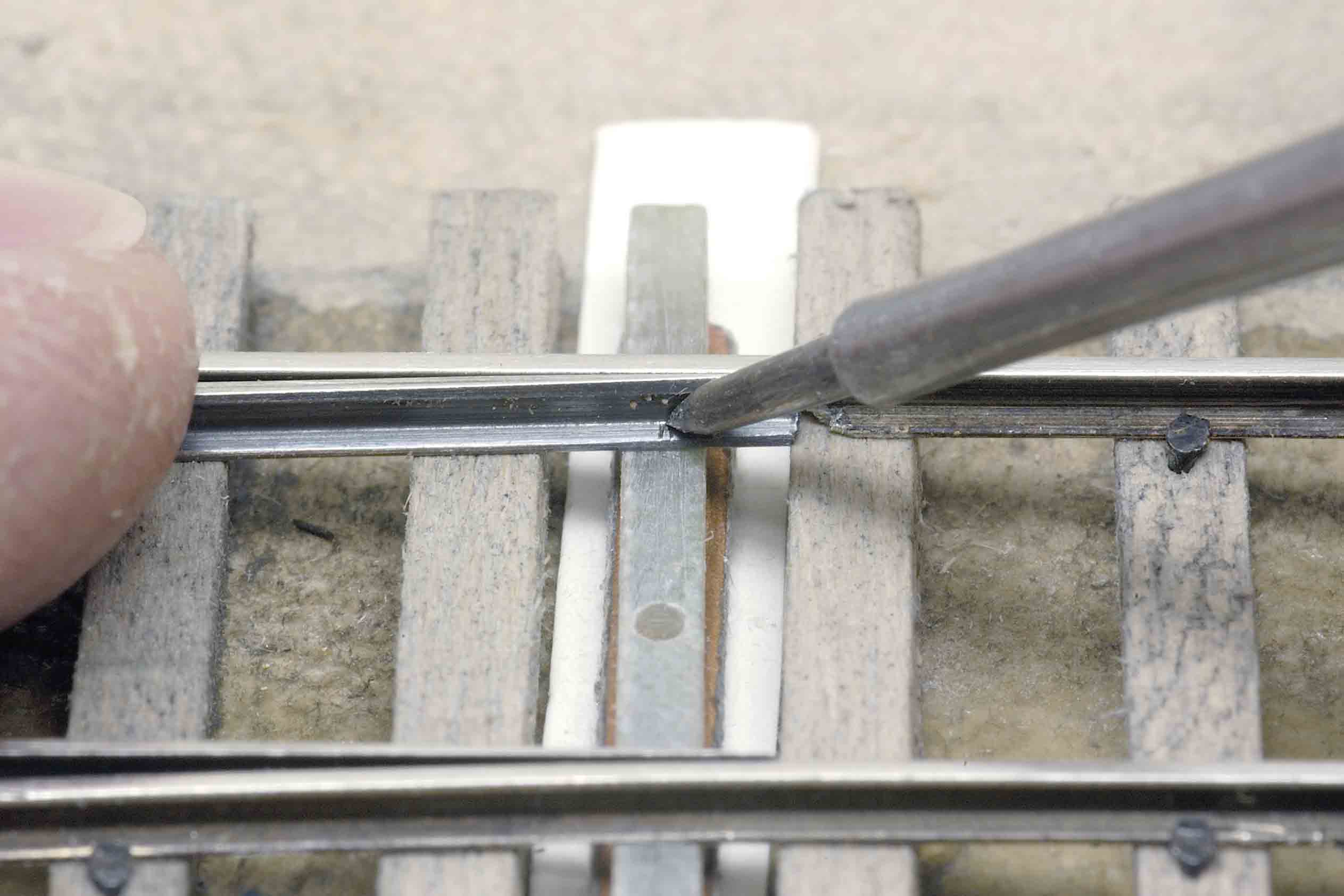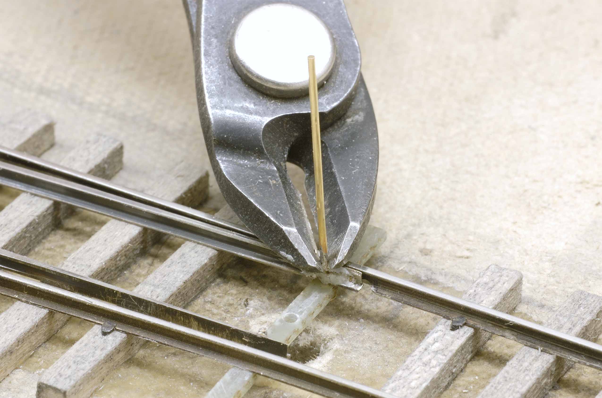 ![]() The two pins were placed in the throw bar and carefully worked and turned up into position. It was awkward and took some gentle bending, but I finally got it into place. The throw bar was lined up and the end of the point rails were re-spiked and soldered for the final time to their printed circuit ties near the frog. Another PC tie was temporarily wedged into place below the throw bar to raise it into position so that the pins were now resting in their respective notches with their heads firmly held tight against its underside. A small piece of wood, equal to the point gap distance, was set in place between the stock rails and points to keep their metal faces separated while the pins were soldered into the filed gaps with a 25 watt soldering iron. | ![]() Wearing eye protection, the excess length of pin material extending above the rail head was trimmed away with a pair of flush cutting nippers the points and throw bar moved a bit to assure that the pins were free, allowing them to rotate without putting any strain on the solder joints. |