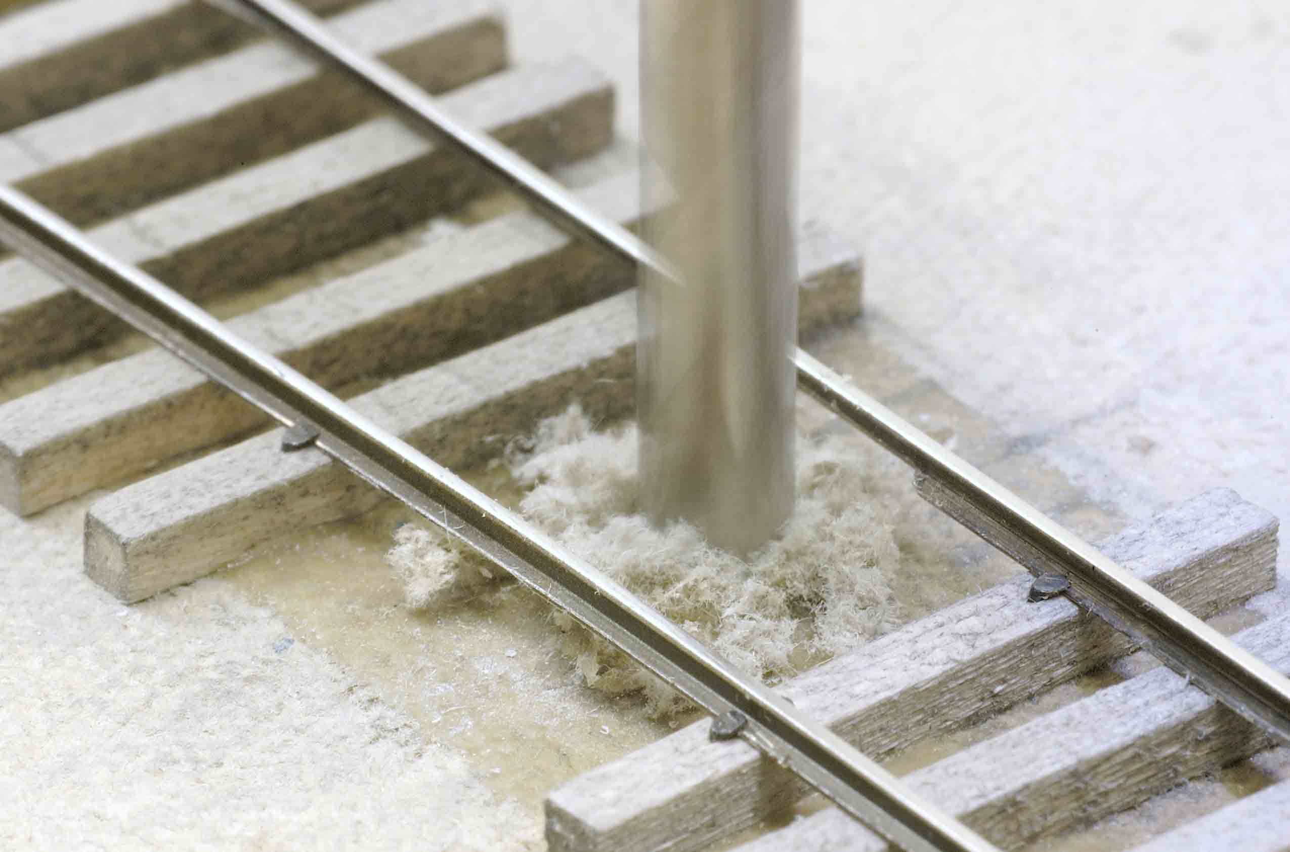 ![]() The throw bar was removed one more time and clearance holes were drilled for the brass pins. I wanted them to be able to rotate in the throw bar. I used a #69 drill, which is a bit larger than the .023" diameter of the brass pins. Because the copper plating was removed from the underside of the throw bar, I didn't have to worry about the heads of the pins causing any electrical shorts. | ![]() The throw bar was again set in its proper location. A 55 drill was pushed through the drilled hole for the actuating wire to make a mark in the Homasote. Since the two point rails were still out of the way, a 1/4" hole was drilled through the Homasote and 5/8" Industrial Particle Board sub-roadbed at the marked site. I increased the size of the hole through the particle board from below with a slightly larger drill, being careful not to go into the Homasote because I wanted the larger diameter to eliminate any chance that the throw bar actuating wire might hit the wood. |