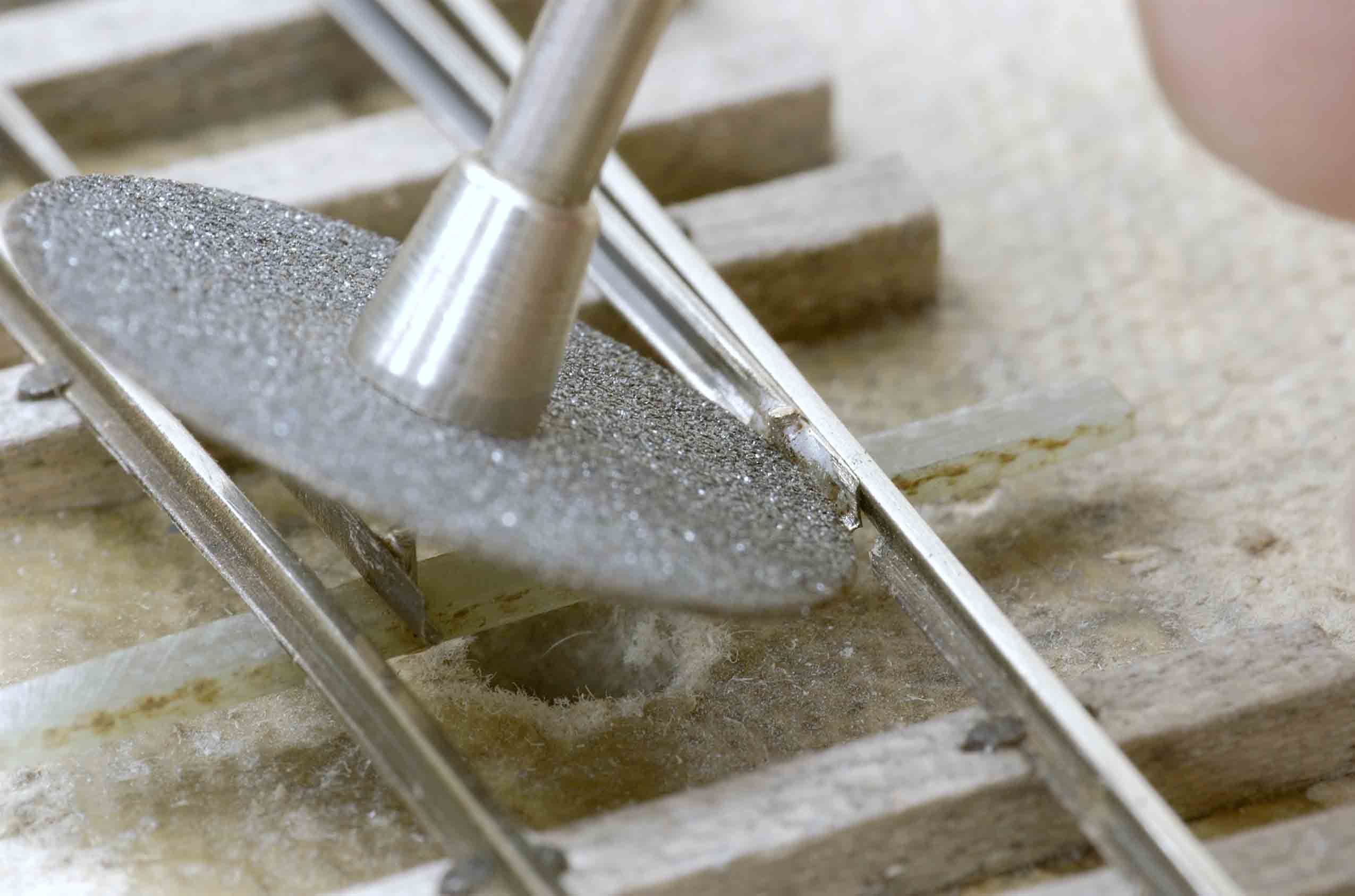 ![]() A cut-off disk and a Dremel tool made it easy to quickly dress up the solder joint on the inside of the point rail. I had to be extremely careful to not remove too much material because I could have ground off the short nub of the brass pin touching the rail. | ![]() Tortoise switch machines are used to throw all my turnouts. To help aid in locating their actuating wire, I use a simple wood and wire jig I made from the same actuating wire material that's used on the Tortoise. It's simply placed through the hole in the throw bar. To keep it in place when I'm working under the layout, I'll set a real railroad spike on the wooden block to keep it from moving. |