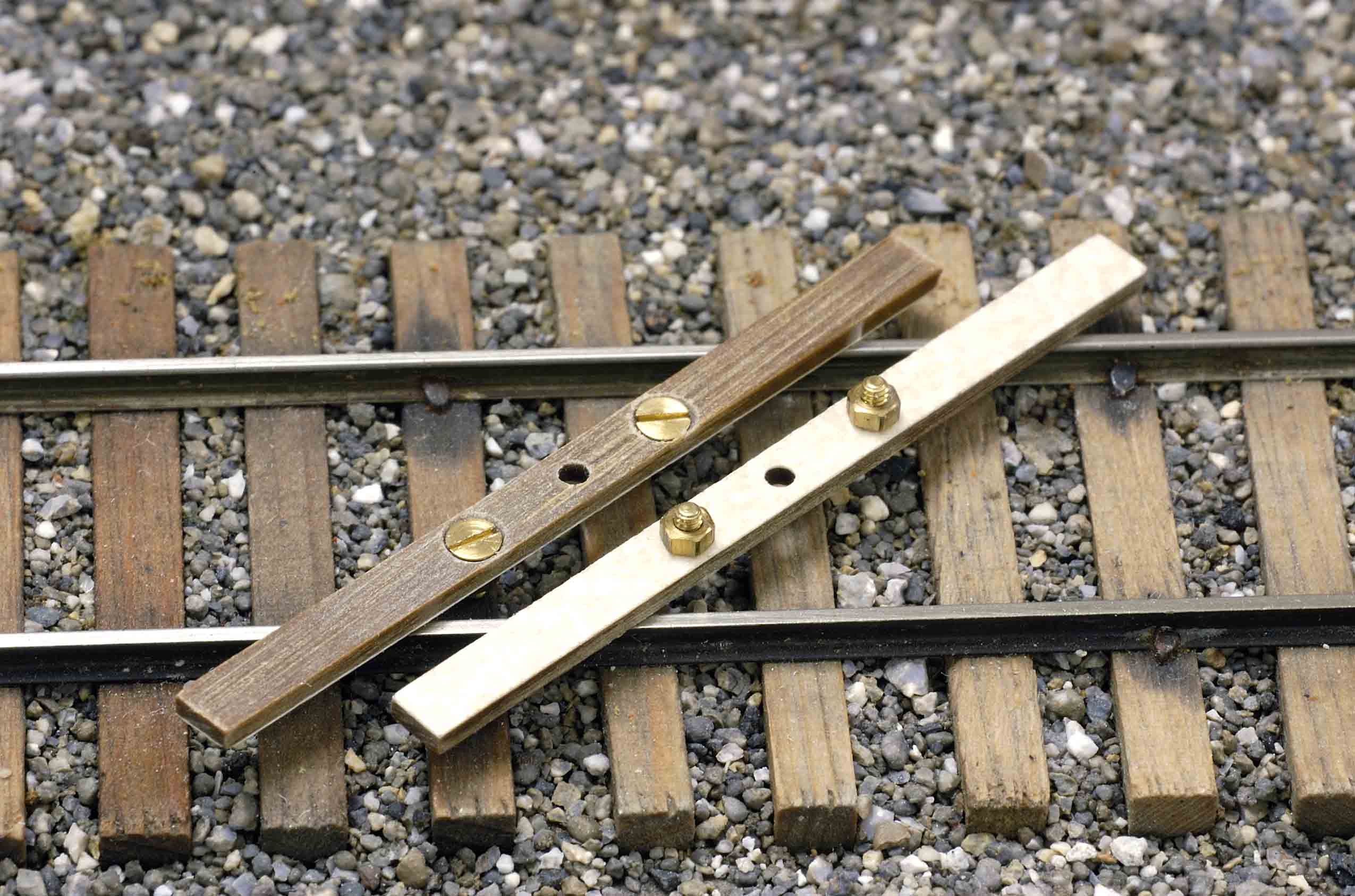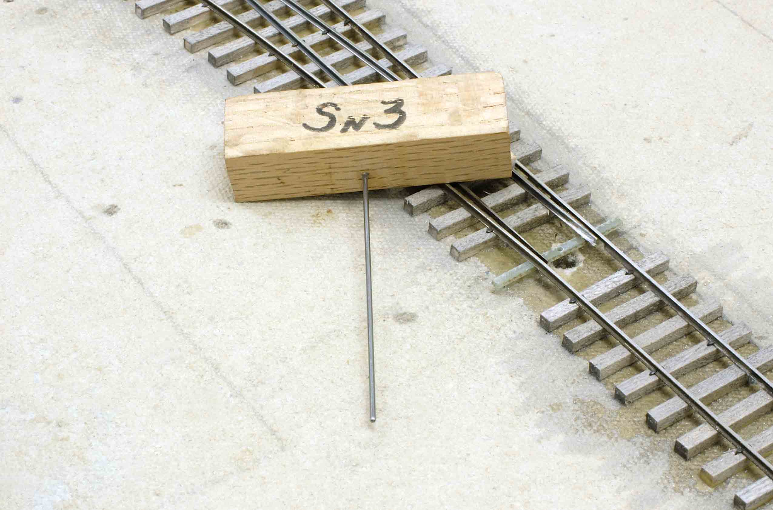 ![]() I first tried to see if I could get solder to bond to an ordinary steel straight pin but wasn't very successful, even after coating it with a lot of flux. They were the common silver looking pins that are used to hold men's shirt together when they are on the display racks. I then tried making my own pins out of brass wire, but I failed miserably when I tried mashing one of the ends down to form a flat head. I had better luck cruising the jewelry making aisle at our local, "Hobby Lobby," store when I came across a package of one inch long, single headed brass colored pins packaged by, "The Jewelry Shoppe Findings," ( www.craftetc.com ). The price was 36 pins for a dollar which seemed right to me. However, before taking them home, I checked them with a magnet that I found in another aisle to determine if they were steel and would probably act just like the other pins I had at home. The brass looking pins weren't affected by the magnet, so home they went where I tested one and found it accepted solder. | ![]() My next step was to make the actual throw bar from a short length of, "Clover House," (www.cloverhouse.com) throw bar material. It's a thin strip of double sided printed circuit board. The copper plated surfaces were rubbed on a sheet of 150 grit sand paper to remove the plating, leaving the bare fiberglass material behind. I knew I could have simply cut a couple of gaps in the bottom side plating but I wanted to remove it just to be safe. I tried removing the copper plating with Radio Shack's, "Archer's Etchant," but it took longer than the sanding, but I'm sure that method would eventually have worked. After measuring and cutting it to length, I drilled a hole in its center for the actuating wire from a Tortoise switch machine. I've discovered that the wire that is packaged with the Tortoise machines wasn't strong enough to move the throw bars on my turnouts so I use .047" music wire instead. I also used the #55 drill, which is .052" in diameter, to enlarge the respective factory drilled holes in the Tortoise housing. | ![]() With the actuating hole drilled, the two point rails were temporarily spiked back in place. The throw bar was wedged in with shims under the. A needle scribe was used to mark the point rails where they met the throw bar. They were removed once again so that tiny notches could be filed into their flange. These notches would be the locations of the brass pins. | ![]() The notched point rails were slid back in the turnout and the throw bar was wedged in place with the notches in the points centered on it. I used the NMRA Sn3 track gauge to determine the proper gap between the point and stock rail, then a sharp needle was used to put a tiny, "dent," in the throw bar. |