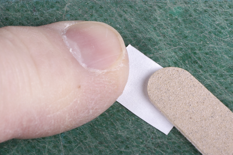 ![]() Photo 5. I wasn't happy with the sanding stick method and now thin the signs by lightly dampening the backing paper with water and very carefully rubbing it with my finger or the tip of a modeling knife blade. The idea is to remove enough paper to see the backside of the ink layer. | ![]() Photo 6. If done carefully, the paper will slowly form itself into a ball or clump which can be moved completely off the back of the sign. |